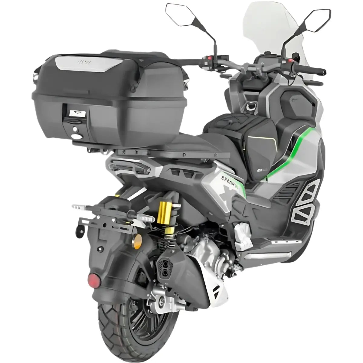 O sistema de fixação Monolock® permite uma instalação fácil e segura, compatível com uma ampla variedade de motocicletas e scooters. Acompanha base universal para montagem, sendo necessário que a motocicleta possua uma grade ou suporte traseiro adequado.
