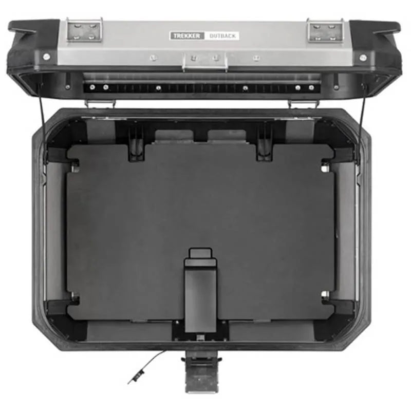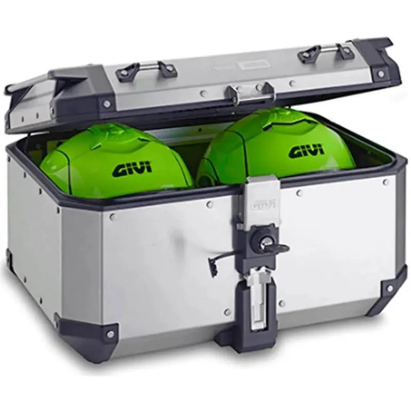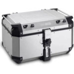 Baú Traseiro / Central Trekker Outback em Alumínio, têm uma capacidade impressionante de 58 litros. O Top Case Trekker Outback pode caber confortavelmente dois capacetes. Possui o sistema Monokey revolucionário da GIVI permitindo um fácil bloqueio, fechamento e abertura.