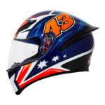 Esta é a nova réplica de capacete de MotoGP da JACK MILLER 2016 que a AGV lançou. O design original do capacete foi criado por Starline Designers, a equipe por trás de muitos trabalhos de pintura de capacete de corrida icônicos, e possui um esquema de cores australiano adequado com um padrão vermelho, branco e azul e estrelas brancas menores posicionadas nas laterais. Uma espécie de reminiscência dos designs de capacete de Casey Stoner e Mick Doohan.
