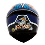 O capacete também apresenta o logotipo ‘Jackass’ de Miller na parte traseira – um burro de desenho animado cercado por chaves inglesas agitando uma bandeira australiana. Os lados do capacete também apresentam o número da corrida de Miller ’43’ em ambos os lados.