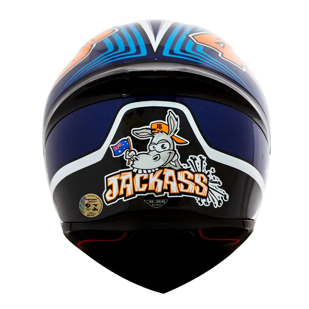 O capacete também apresenta o logotipo ‘Jackass’ de Miller na parte traseira – um burro de desenho animado cercado por chaves inglesas agitando uma bandeira australiana. Os lados do capacete também apresentam o número da corrida de Miller ’43’ em ambos os lados.