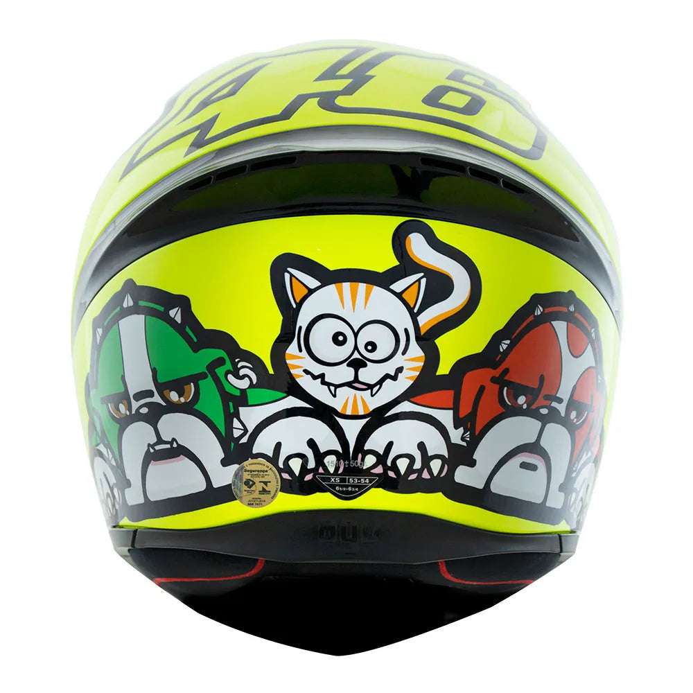 Na parte traseira do capacete os animais de estimação do piloto estão presentes intercalando as cores da bandeira italiana.