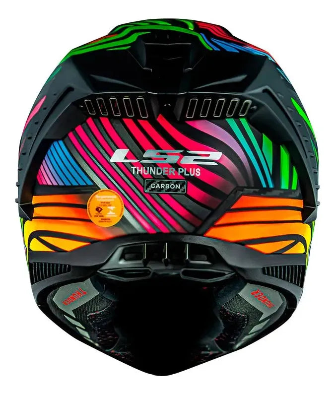 O design do LS2 Thunder teve cada linha cuidadosamente pensada para alcançar o melhor equilíbrio. O casco é fabricado em Carbono 3K (3.000 fios de carbono por trama), resultando em um capacete mais leve e resistente, com somente 1.400 kg (+- 50g). A leveza do Thunder vem acompanhada de uma estabilidade precisa, garantida pela forma Long Oval junto ao Super Spoiler utilizado na parte traseira, que minimiza o arrasto do vento direcionando todo ar para o (cupim) do macacão.